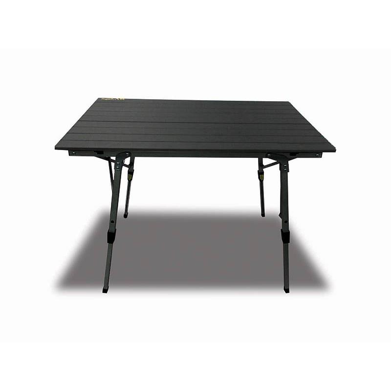 een grote, lichte tafel voor alle terreinen. gemaakt van aluminium met een geanodiseerde zwarte afwerking, de vier poten zijn onafhankelijk verstelbaar, waardoor de tafel op allerlei ondergronden waterpas kan worden gezet.
