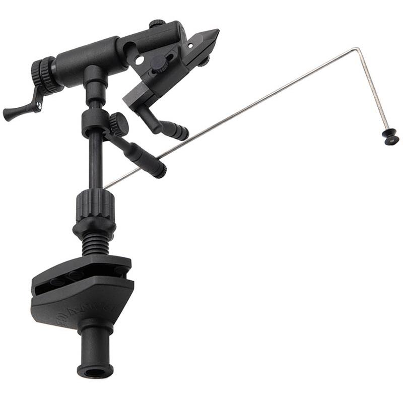 roterende bankschroef die heel eenvoudig te gebruiken is. de kaken zijn verstelbaar zodat de haaksteel in de rotatieas wordt geplaatst, wat het mogelijk maakt om hackles en alle materialen met aansluitende windingen te wikkelen, met grote precisie en zonder enige trilling.