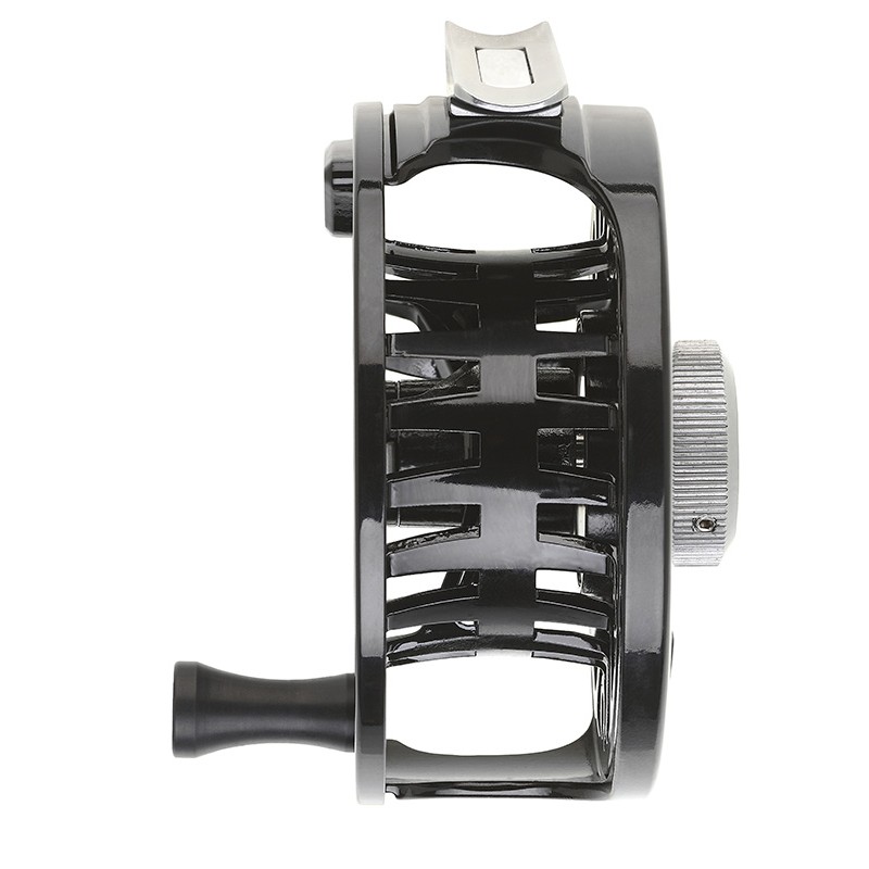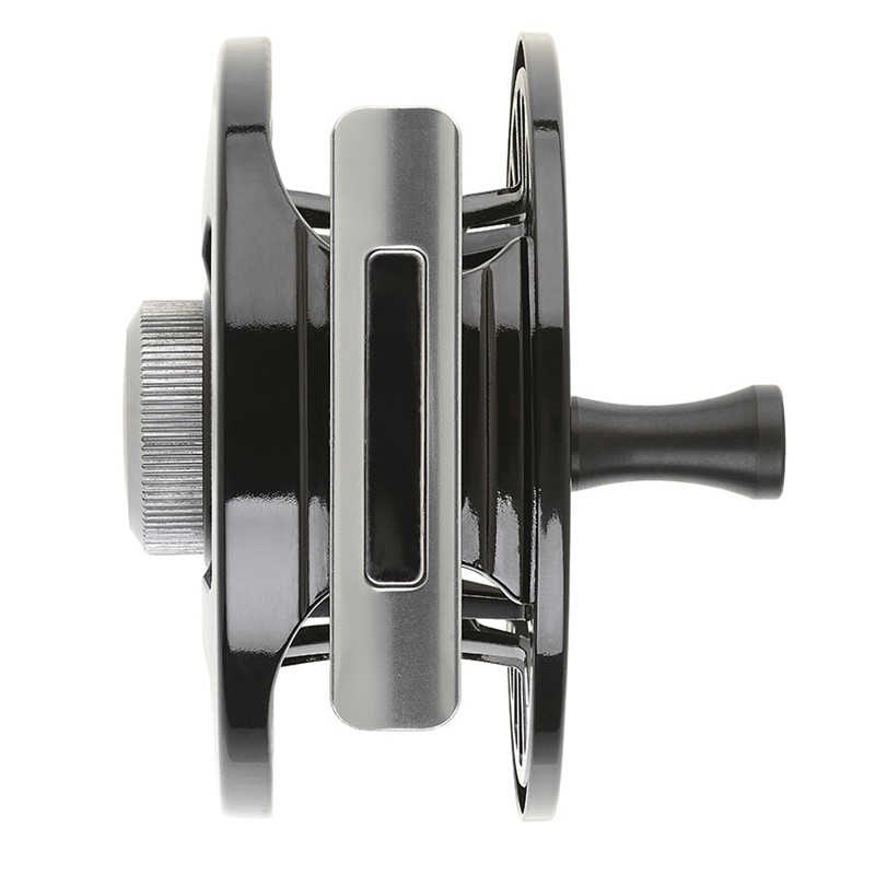 Kenmerken : • Gegoten en bewerkt aluminium • Geanodiseerd zwart en chroom • Micrometrische rem • Large arbor-spoel • Omkeerbaar rechts-/linkshandig • Neopreenhoes