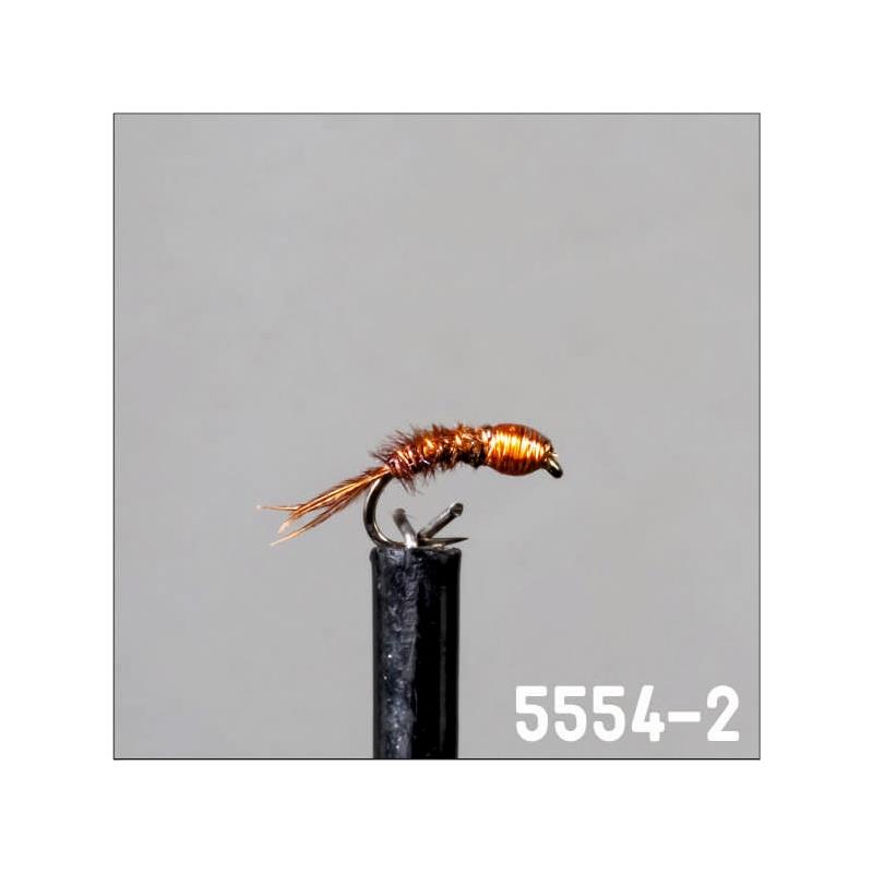 5554-2 : Zeer lichte nymf op gebogen potence, geclassificeerd als imitatieve nymf. Model geïnspireerd op de beroemde « Pheasant Tail ». Lichaam van fazant met kop en omsnoering in koperdraad. Een algehele nymf met een natuurlijk uiterlijk.