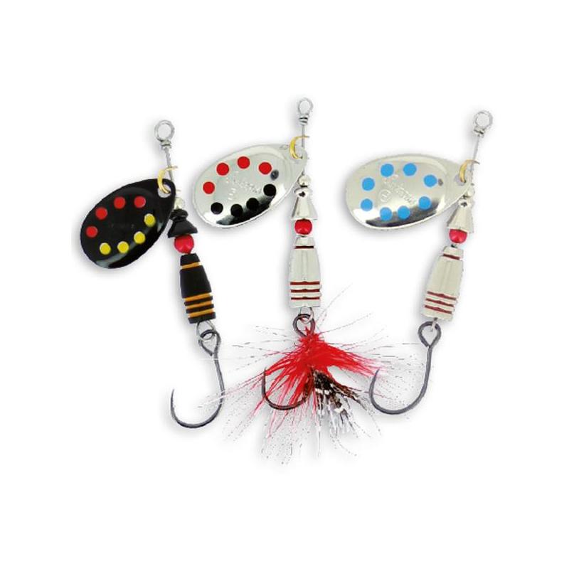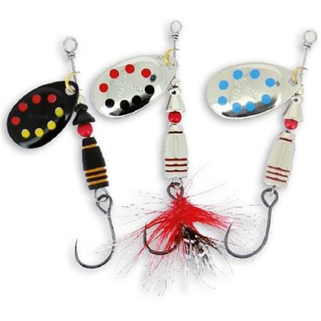 Zestaw łyżek Suissex «parcours truite» zamocowanych na pojedynczym haczyku bez zadziora, składa się z :