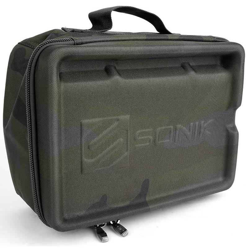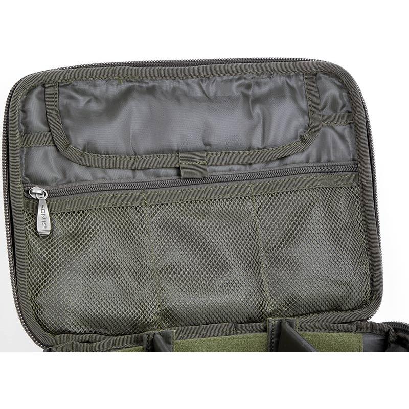 Cechy : • Duża kieszeń na akcesoria elektroniczne do transportu i ochrony Twoich urządzeń elektronicznych • Sztywny blat z EVA z wbudowanym uchwytem na telefon lub tablet • Materiał kamuflażowy Bank-Tek z powłoką z PVC HD 600D i wodoodporną podstawą. • Dwa suwaki zamka błyskawicznego umożliwiające łatwe wejście/wyjście kabli ładujących • Wyjmowane, w pełni wyściełane przegrody do uporządkowanego przechowywania • Wewnętrzna kieszeń na tablet • Wewnętrzne kieszenie z siatki do organizacji kabli • Podwójne, solidne zamki błyskawiczne o grubości 10 mm