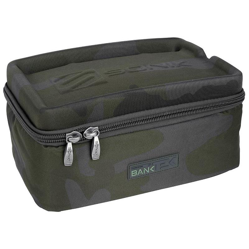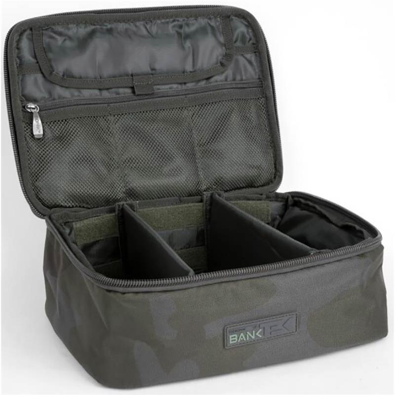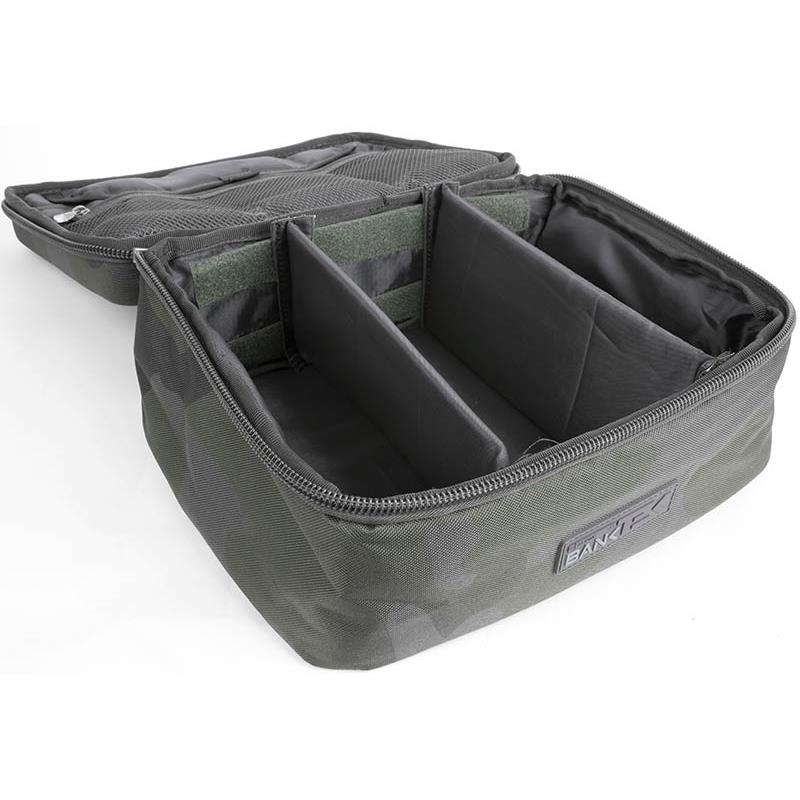 BANK-TEK GADGET TABLE PACK ma dodatkową zaletę w postaci sztywnego blatu z EVA z wbudowanym uchwytem na telefon lub tablet. Wnętrze jest całkowicie wyściełane i wyposażone w wyjmowane przegrody, dzięki czemu możesz dostosować sposób przechowywania. Projekt zawiera wewnętrzną kieszeń na tablet oraz oddzielne kieszenie z siatki do bezpiecznego przechowywania kabli oraz dwa suwaki zamka błyskawicznego umożliwiające wejście/wyjście kabli ładujących. Wykonany z wytrzymałego materiału kamuflażowego BANK-TEK w PVC HD 600D i z wodoodporną podstawą, oraz wyposażony w podwójne, solidne zamki błyskawiczne o grubości 10 mm.