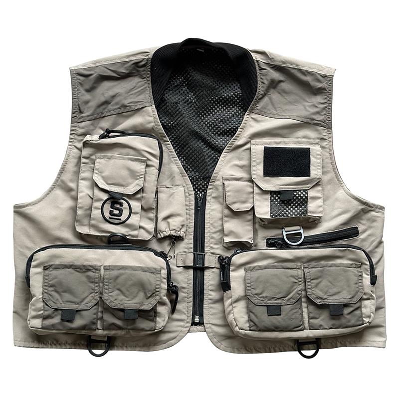 11 przednich kieszeni zewnętrznych, 1 kieszeń na nóż, 1cordon do mocowania akcesoriów chowany, 4 przednie klamry do mocowania, gruby wygodny kołnierz, tylna pętla na podbierak, 1 duża tylna kieszeń zapinana na zamek, 2 boczne zamki błyskawiczne do rozszerzenia obwodu.
