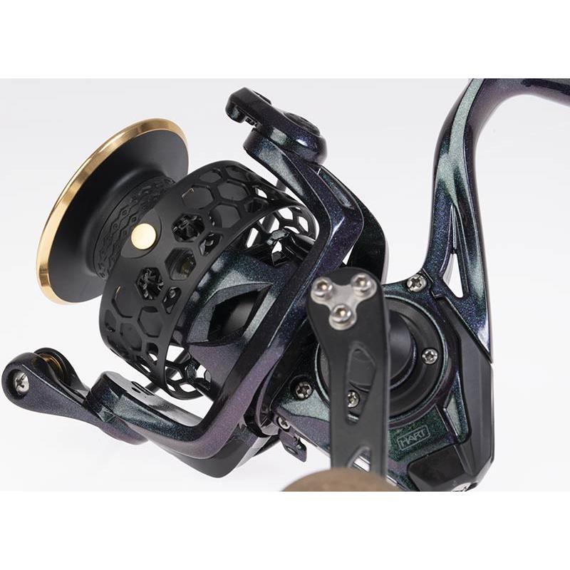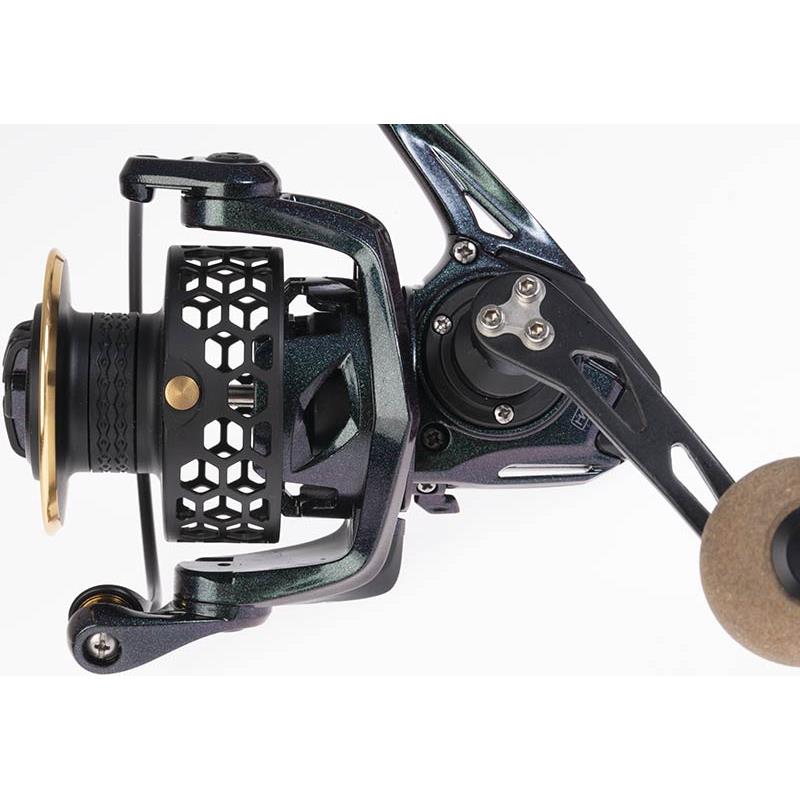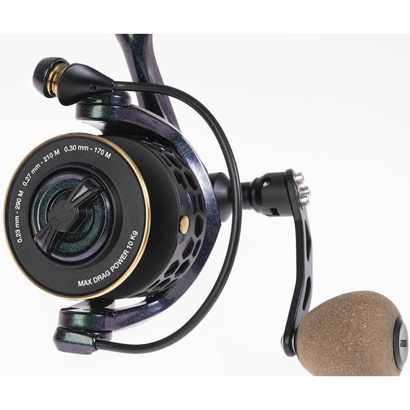 Kołowrotek z lekkim korpusem i rotorem z grafitu. Idealny do spinningu dzięki wysokiemu przełożeniu. Szpula obrabiana maszynowo z wieloma perforacjami, aby zmniejszyć jej wagę. Ultra lekka korbka z gładkiego aluminium, z gałką z korka i gumy. Łożyska ze stali nierdzewnej. Hamulec mieszany z filcu i stali nierdzewnej.