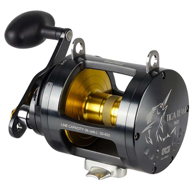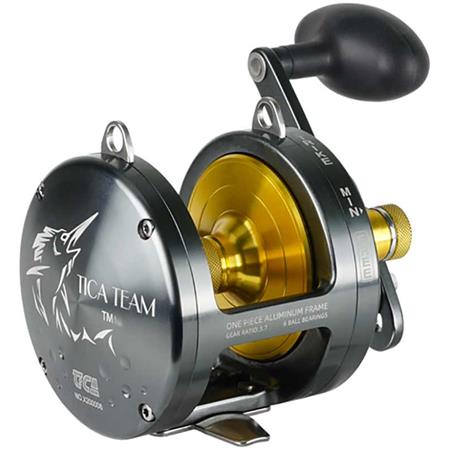 Zbudowany z aluminium, kołowrotek TICATEAM TM jest specjalnie zaprojektowany do połowów big game na morzu. Dzięki hamulcowi dźwigniowemu, stosowanemu głównie podczas połowów z łodzi ukierunkowanych na tuńczyki, TICATEAM ma wiele zalet, które pozwolą mu wytrzymać silne walki. • 6 łożysk kulkowych zabezpieczonych przed korozją • Korpus z jednego kawałka aluminium obrabianego CNC. • Szpula z kutego aluminium • Natychmiastowy antyzwrot: aby zapobiec odwijaniu się żyłki • Koło zębate hamulca i mechanizm ze stali nierdzewnej • Hamulec dźwigniowy • System 2 prędkości: system o dwóch przełożeniach, wolniejsze zapewnia maksymalną siłę, natomiast szybsze umożliwia szybsze nawijanie (niezbędne do połowu dużych okazów). • Regulowana korbka aluminiowa • Głośny sygnalizator • Mikrometryczne wstępne napięcie hamulca • Pokrowiec transportowy
