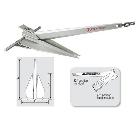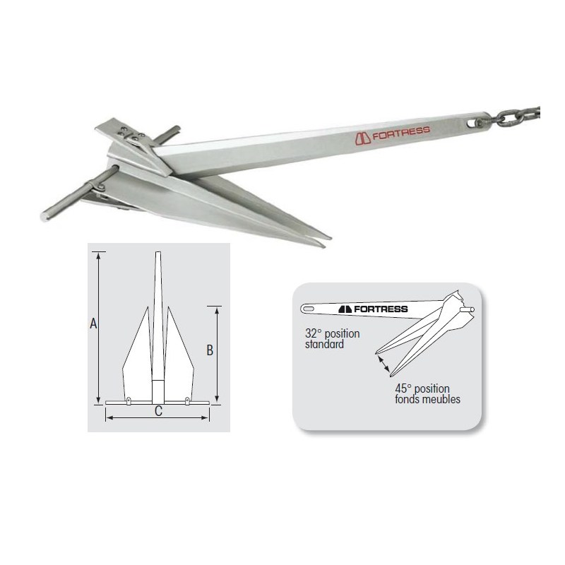 Najbardziej renomowana z lekkich kotwic: legendarna Fortress, o powszechnie uznanych osiągach. Całkowicie demontowalna, bardzo łatwa w obsłudze dla całej załogi. Wyłącznie w modelu Fortress: łopaty regulowane w zakresie 32° do 45°, pozwalające zwiększyć trzymanie kotwicy o 400 % na miękkim dnie.