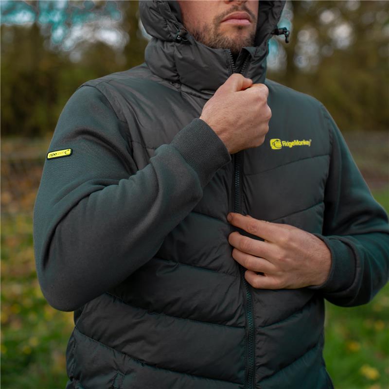 Charakterystyka : • Mieszanka bawełny/poliesteru w naszym charakterystycznym zielonym kolorze • Podszycie z szczotkowanego polaru • Wyściełany panel tułowia z syntetycznym puchem • Zamek błyskawiczny z przodu na całą długość ze zintegrowaną listwą przeciwdeszczową • Regulowany kaptur typu shell z wysokim kołnierzem • Elastyczne mankiety z otworem na kciuk i regulowanym obszyciem • Kieszenie na piersi i boczne zapinane na zamek • Konstrukcja z ruchomych paneli • Charakterystyczne, lecz dyskretne logo RidgeMonkey APEarel