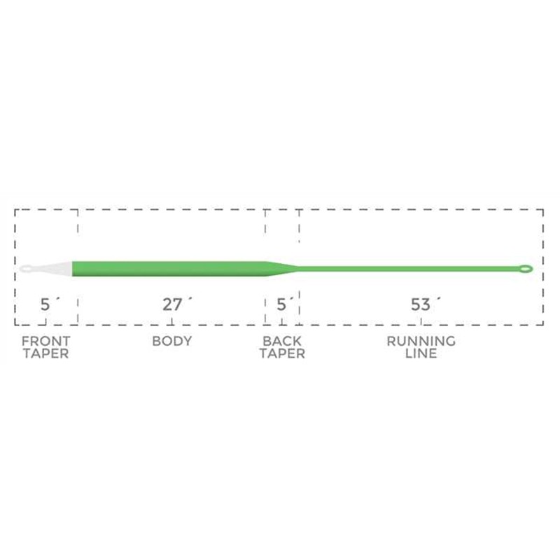 Linka muchowa z przezroczystą końcówką o pośrednim zanurzeniu długości 1,5 m, idealna do połowów na zbiornikach na głębokościach od powierzchni do 1.5 m lub do łowienia na nimfę w rzekach i potokach.