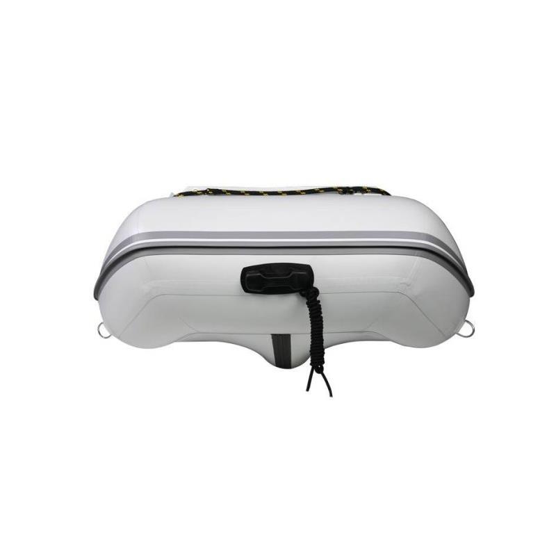 • Nowatorski design i wzmocnione tylne stożki. • Harmonia jasnoszarego i łupkowego odcienia szarości. • Czarny uchwyt z żółtą siatką z polipropylenu Ø 10 mm zapewniający pewny chwyt. • Uchwyt na wiosła na dnie łodzi pomocniczej. • Pas do mocowania zbiornika. • Konstrukcja z PVC 1100 Decitex dla lepszej odporności na ścieranie.