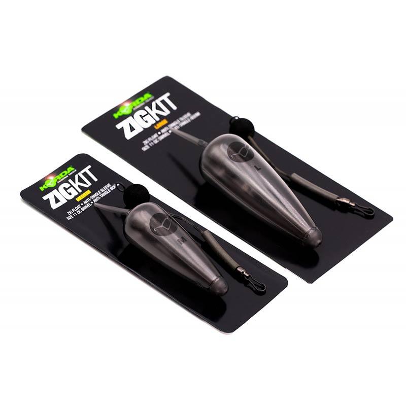 Zig Kit jest dostarczany z sztywną sekcją, która umożliwia łatwe wyniesienie pływaka na powierzchnię celem ustawienia go na pożądaną długość, a na końcu której mocowany jest ciężarek. Sztywna sekcja wyposażona jest w duże oczko, które pozwala żyłce głównej swobodnie się przesuwać, oraz w piankową kulkę, której zadaniem jest odsunięcie oczka od śmieci mogących znajdować się na dnie. Na drugim końcu krętlik z łożyskiem kulkowym połączony z Kwik Link umożliwia szybką rotację i zapobiega splątaniom. Wystarczy dodać haczyk, przynętę, kawałek rozpuszczalnej pianki i pozostaje tylko zarzucić! Dostępny w dwóch rozmiarach, Medium i Large, Zig Kit może być używany na dowolną odległość. Każdy zestaw zawiera Zig Float, Anti Tangle Sleeve, QC Swivel w rozmiarze 11 oraz sztywną sekcję do mocowania ciężarka.