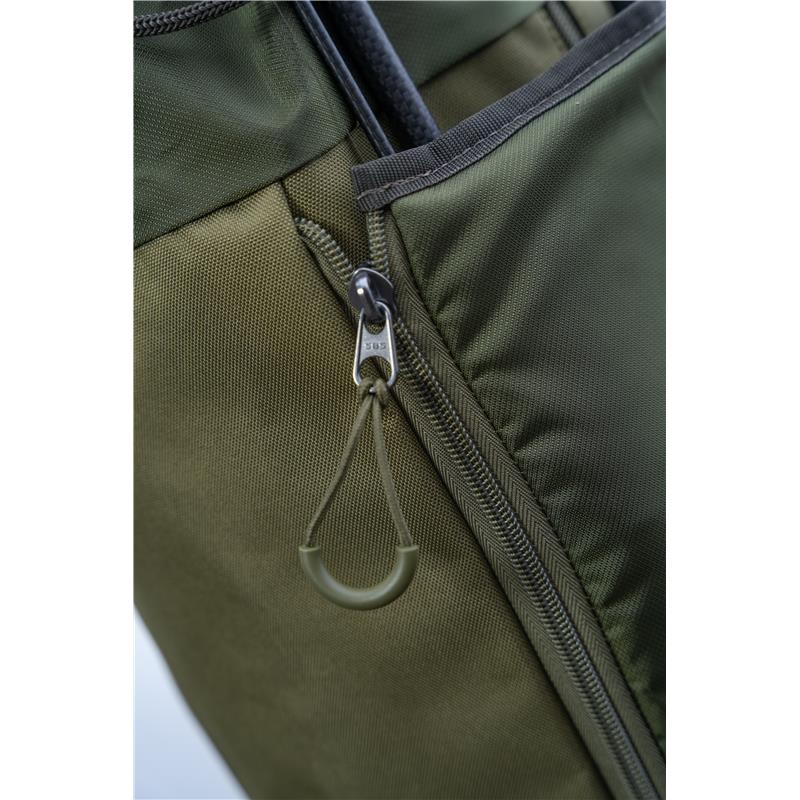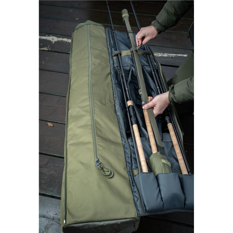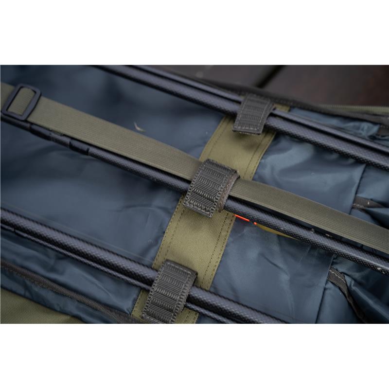 Nowy, innowacyjny sposób transportu wędzisk i kołowrotków, a także shelteru lub brolly oraz Twojego sprzętu wędkarskiego. Przegródka na wędziska składa się bezpośrednio na tylnej komorze, w której przechowywane jest schronienie, oferując wszystkie zalety pełnego pokrowca z dodatkową ochroną dla wędzisk. Posiada wyściełaną część zaprojektowaną tak, aby wygodnie pomieścić trzy wędziska z kołowrotkami, oraz większą tylną przestrzeń, która pozwala na przechowywanie każdego typu schronienia Korum. Ma również zewnętrzną kieszeń na podbierak i banksticks. Wyposażony jest w odpinany i regulowany wyściełany pasek na ramię dla komfortowego transportu. • 26 x 18 x 155