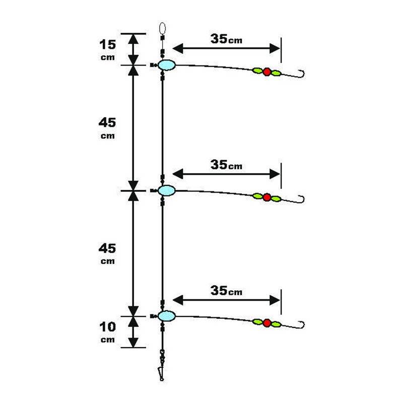 • montaż: specjalny na dorszowate (merlan, tacaud, cabillaud…) • przynęty: pasek kalmara, chipirony, kawałeczki makreli lub sardynki • porada: użyj ciężarka typu „jajko” w kolorze (biały, żółty…) od 110g do 220g w zależności od prądu • długość 115cm • 3 przypony z fluorocarbonu po 35cm