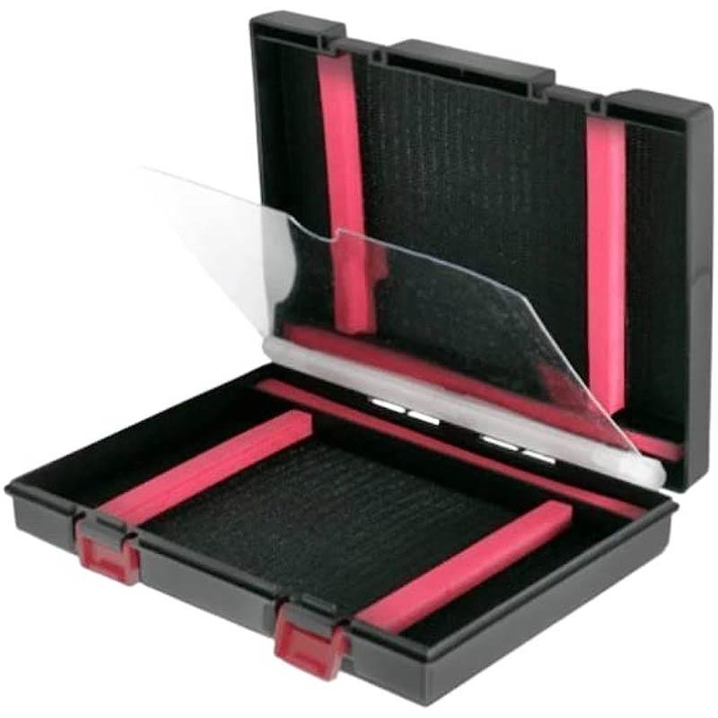 pudełko na sztuczne przynęty zaprojektowane do trout area i light spinning. wyposażone w uchwyty na przynęty o różnych rozmiarach, które można zamocować w dowolnej pozycji wewnątrz obu przegródek pudełka. przezroczysta przegroda zapobiega splątaniu się przynęt z dwóch różnych przegródek. doskonałe rozwiązanie do przechowywania błystek i twardych przynęt.