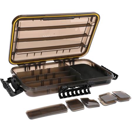 Czarne pudełka wędkarskie, wodoszczelne w 100 %, z otwieraniem z jednej strony i wyposażone w uszczelki. Dolne przegrody są wyposażone w specjalnie wyciętą piankę. Posiadają również klasyczne, regulowane przegrody bez pianki, umożliwiające przechowywanie wszelkiego rodzaju przynęt.