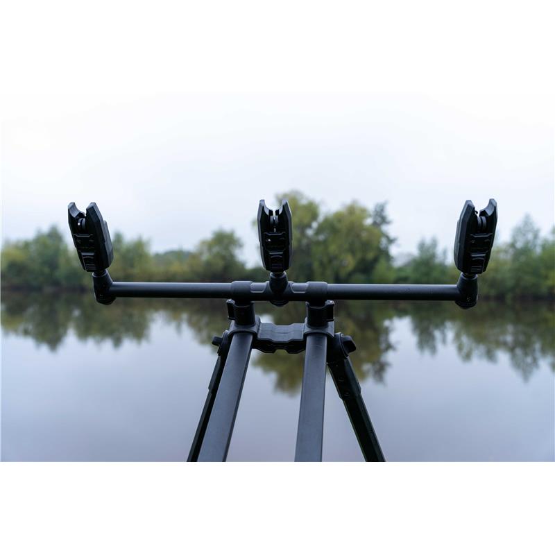 Wykonany z kombinacji podwójnych ram antyskrętnych z regulacjami cam-locks, trójnóg na 3 wędki zapewnia maksymalną stabilność i wszechstronność. Podwójna rama może być wydłużana podczas użytkowania, ale łatwo się składa dzięki systemowi cam-locks, co sprawia, że jest kompaktowy podczas transportu. Trójnóg jest lekki i praktyczny, waży tylko 2,1 kg. Belki buzz bar na 3 wędki są solidne i przymocowane za pomocą mechanizmów typu cam, co umożliwia szybki montaż i demontaż. Mocowanie w dwóch punktach całkowicie eliminuje ryzyko skręcenia lub nierównowagi. Tylny buzz bar jest podwyższony, aby umożliwić łatwe umieszczenie trzech dużych kołowrotków. Przednie nogi można ustawić pod niemal dowolnym kątem i ich wysokość także reguluje się dzięki systemowi typu cam. • Nogi rozciągają się od 1 m do 1,85 m. • Dostarczany z pokrowcem transportowym.