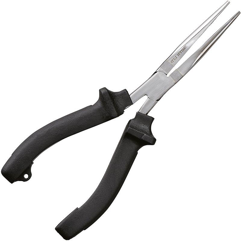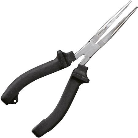 Stal nierdzewna, 208 mm. Te długie szczypce do zdejmowania przynęt posiadają także szczękę zdolną przeciąć odcinek trzonka haczyka o grubości 1 mm. Rękojeść pokryta materiałem absorbującym wstrząsy dla lepszego chwytu.