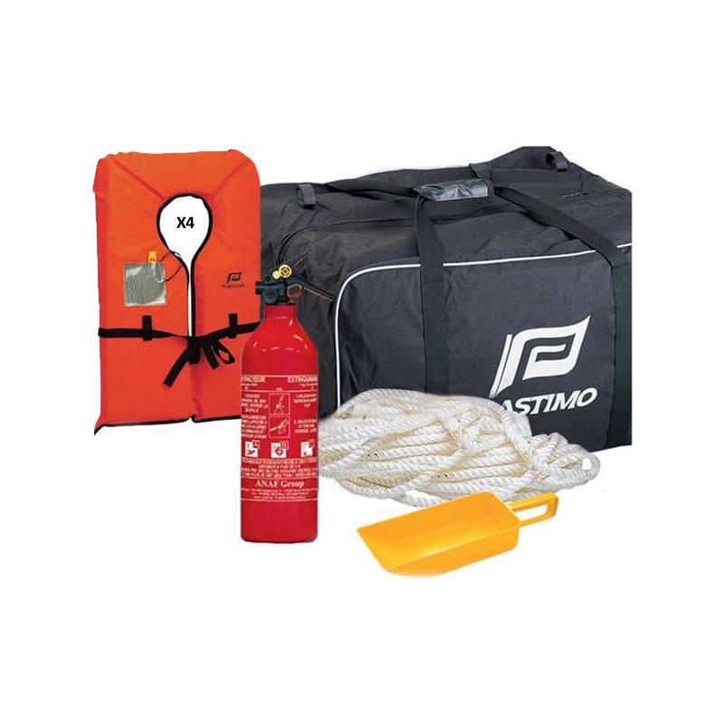 Składa się z czarnej torby 110 L, zawierającej :(4 osoby) • 4 kamizelki ratunkowe Storm-3, 100 N, rozmiary L & XL • Gaśnica proszkowa 1 kg • Czerpak • Lina cumownicza 30 m polipropylen Ø 8 mm