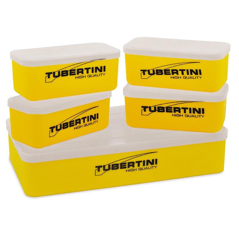 Zestaw plastikowych pudełek do przechowywania składający się z pudełka Kango i czterech mini-pudełekpudełek. Dostępne z perforowaną pokrywką lub bez otworów.