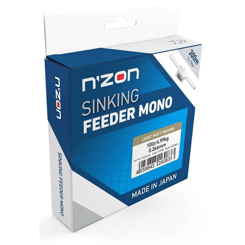 Nylon N'Zon Sinking został zaprojektowany, aby sprostać wymaganiom wędkarzy feederowych. Aby żyłka była jak najbardziej napięta i prosta, co poprawia wykrywanie brań, ten nylon jest tonący. Jest również bardzo miękki, aby łagodzić wstrząsy podczas rzutów. Aby służył przez długi czas, ten nylon jest bardzo odporny na węzły i na ścieranie. W jasnobrązowym kolorze, N'Zon Sinking jest mało odblaskowy, co gwarantuje dużą dyskrecję. Znacznik umieszczono w połowie szpuli (na 150m), aby wskazać wędkarzowi nawiniętą długość, dając mu możliwość równomiernego napełnienia dwóch szpul.