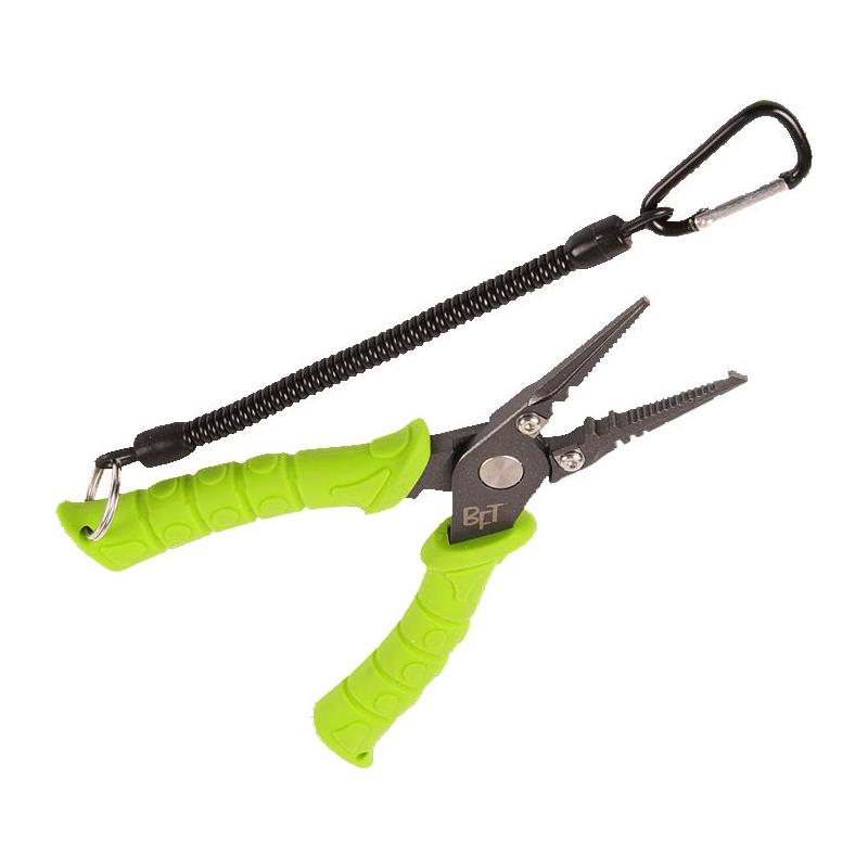 Alicate multifuncional para abrir argolas partidas, crimpar as mangas, cortar o fio e retirar os anzóis dos peixes.