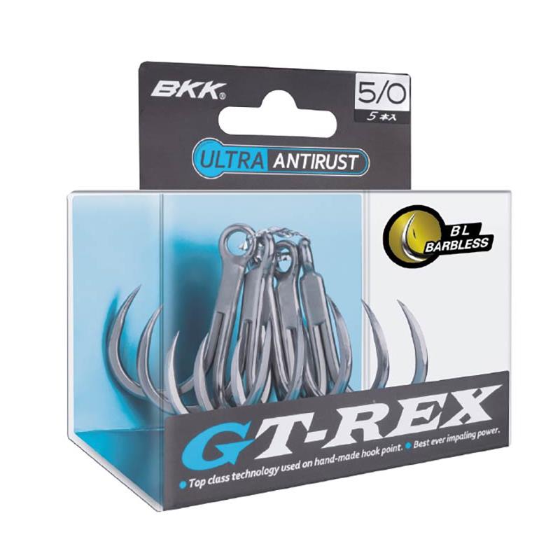 A BKK GT-REX foi desenvolvida para a pesca de carangues gigantes e atuns com poppers. A versão sem farpa do célebre GT-REX permite uma melhor taxa de sobrevivência do peixe durante o C&R. Além disso, a pesca com anzóis triplos sem farpa enfatiza a segurança a bordo ao lançar entre outros pescadores: aprovado pela carta de pesca!