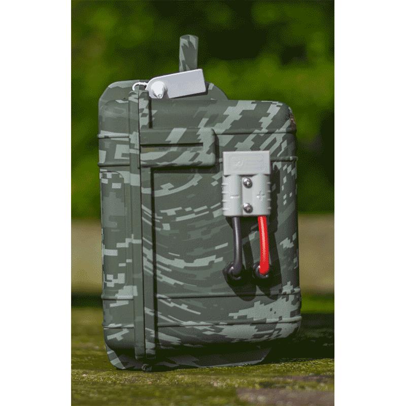 Detalhes do produto : • Carga completa de 50Ah no teu cofre externo em 5 horas com o nosso carregador 12V 10Ah. • Cofre externo 12,8 V 50 Ah LiFeP04. • Capacidade [wh] : 640 wh. • Corrente de descarga máxima [A contínuo] : 100 A. • Peso [kg] : cerca de 6,5 kg. • Dimensões [L x l x A em cm] : 30 x 23 x 15 cm. • Conexões : conector Anderson SB50. • Sistema de gestão da bateria : ajustável através de uma aplicação para smartphone (Bluetooth) • Opções de cor : Preto ou Camuflagem. • Garantia : 3 anos