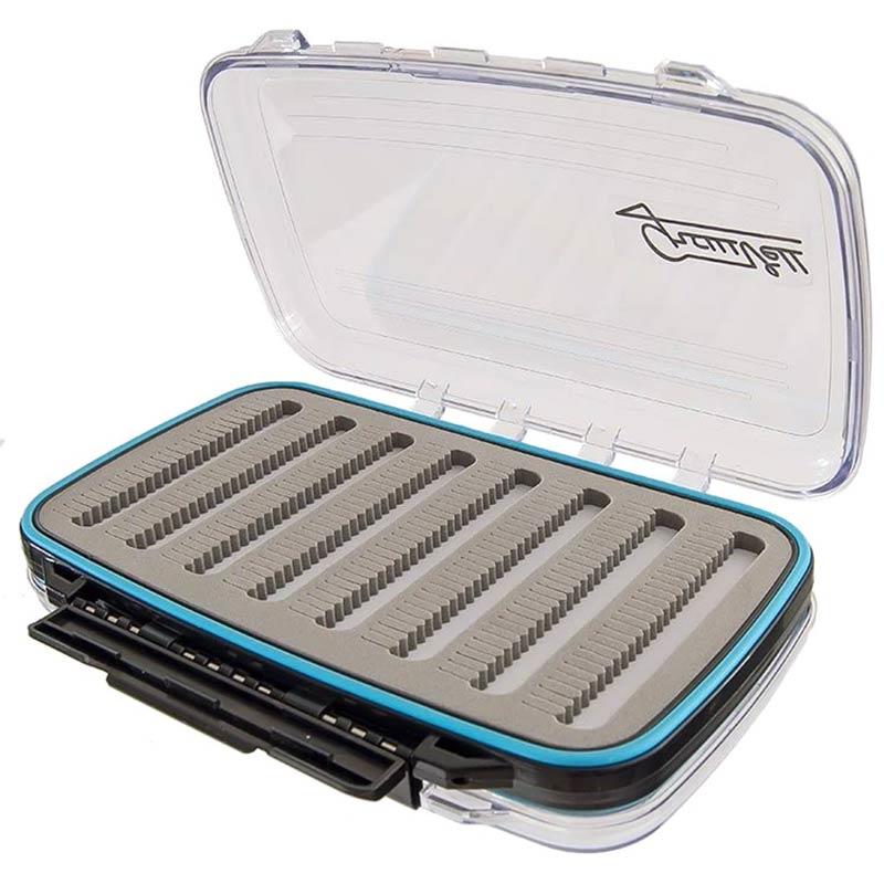 Caixa de moscas dupla face e translúcida. Base em espuma fendida.
