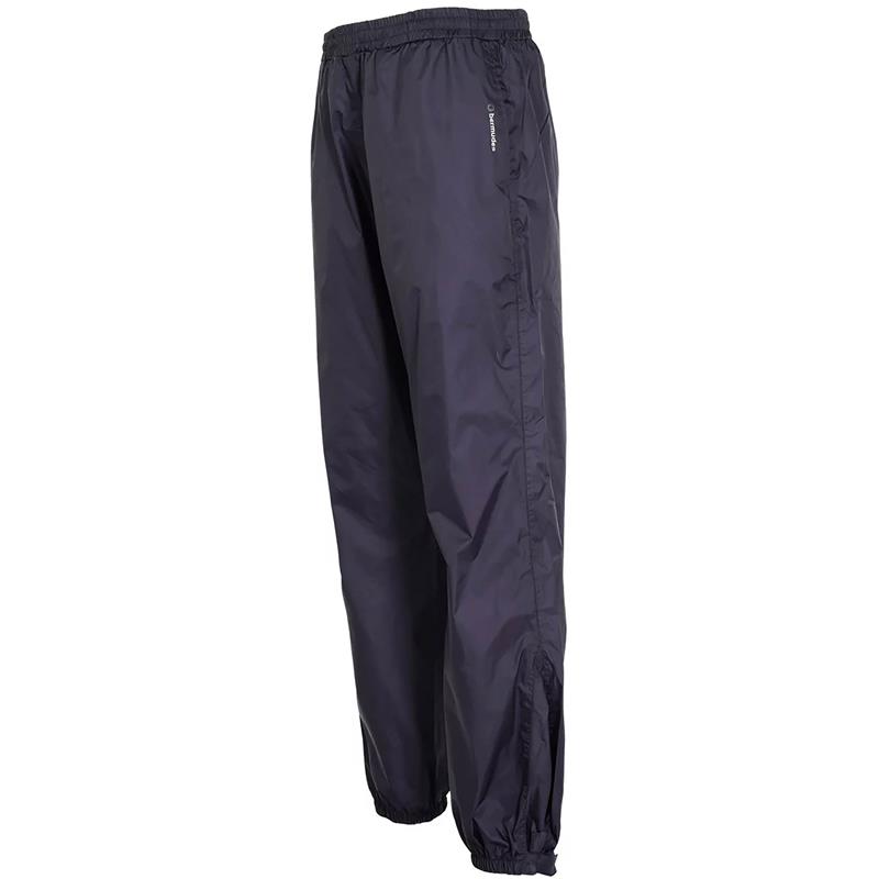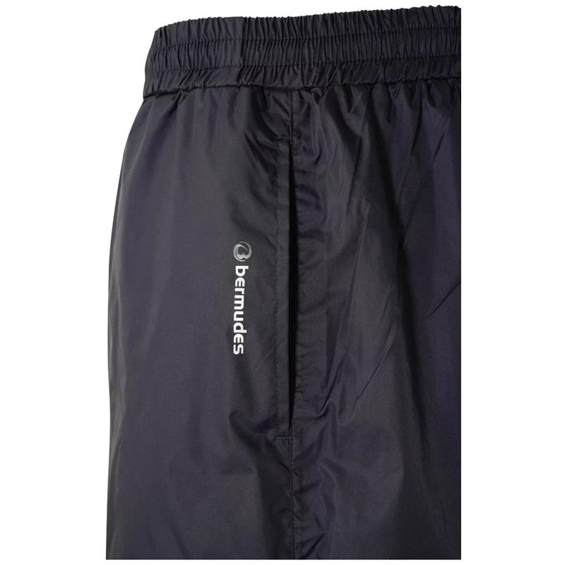 Calças de chuva em tecido impermeável e respirável (3 000 mm/3 000) e tratado para repelir água (DWR). A totalidade das costuras seladas proporciona uma grande impermeabilidade ao produto. A parte inferior da perna elástica possui um sistema de aperto por alça e uma grande abertura para facilitar a passagem da perna e dos sapatos. A serigrafia Bermudas é aplicada na parte superior da perna. As calças vêm com uma bolsa de armazenamento.