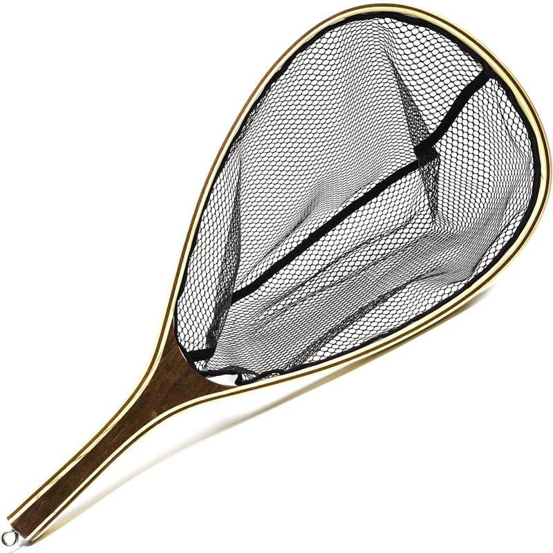 Rede de aterragem de forma oval em madeira com uma rede revestida para preservar e respeitar o peixe.