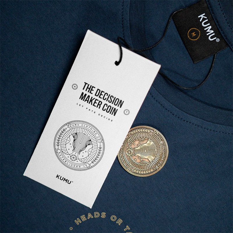 Para harmonizar perfeitamente o conceito, cada t-shirt vem acompanhada de uma moeda "Decisor" GRATUITA escondida na etiqueta, para te ajudar a fazer a tua próxima grande decisão de vida... ou simplesmente para decidir quem ficará com qual lado da dupla banheira na tua próxima sessão de pesca com um amigo.