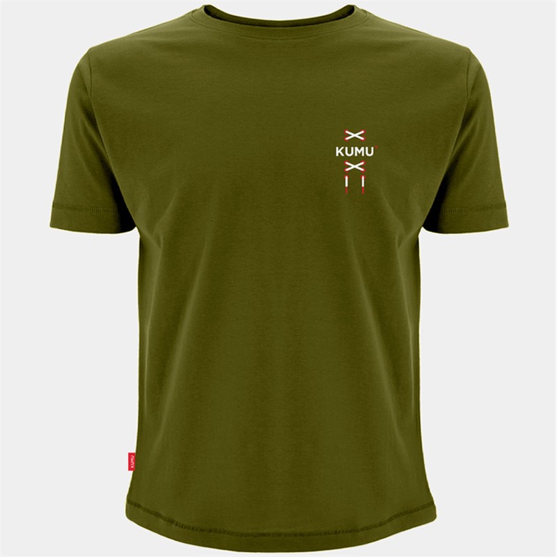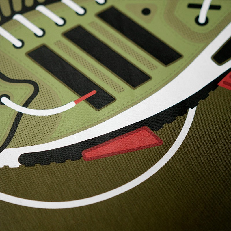 Serigrafia detalhada em 6 cores num tecido verde caqui ultra macio de 150 g/m² com detalhes tecidos nas laterais.