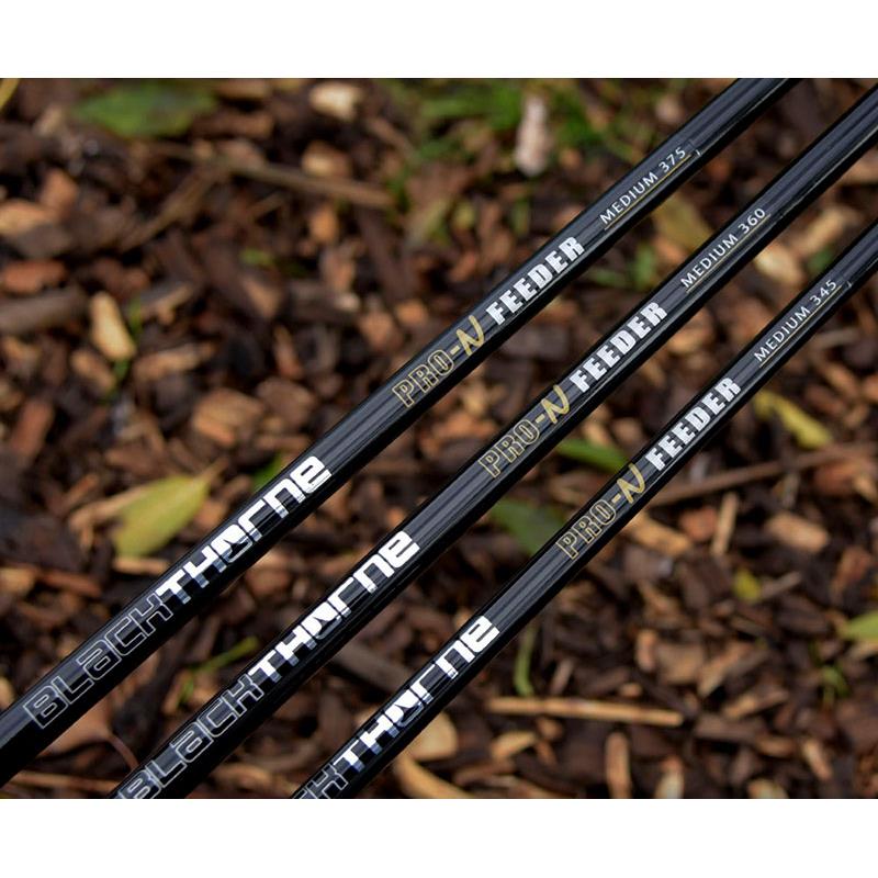 As varas Blackthorne Pro N Feeders Medium são excelentes lançadoras e têm também a vantagem de serem polivalentes. Estão equipadas com 3 ponteiras em carbono de tamanho M (diâmetro na sua extremidade de 2,8mm) que oferecem grande sensibilidade para detectar muito facilmente as mais pequenas toques. O blank é dividido em três partes iguais (ponteira incluída), facilitando assim o seu transporte. A empunhadura é em cortiça e espuma e o seu punho é ajustado em função do comprimento da vara. Nota-se que uma parte do calcanhar é aplanada para maior conforto ao nível do antebraço durante a pesca. Disponível em 3,60 m com uma potência de lançamento compreendida entre 20-50 g e em 3,75 m com uma potência de lançamento compreendida entre 30-60 g.