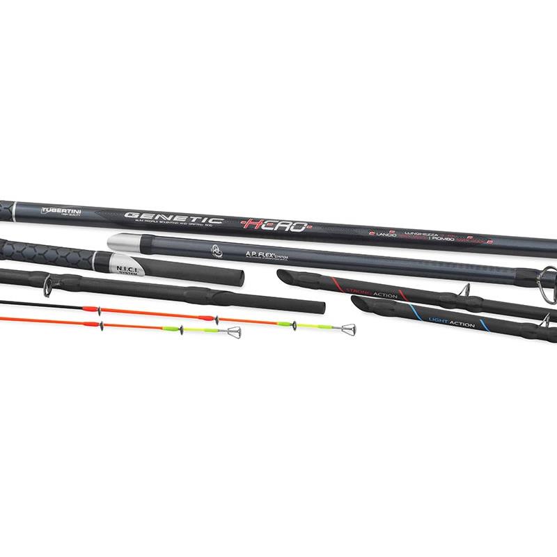 A versão Hero representa a última evolução da série Geneticà de sucesso. Uma série de canas em três partes equipadas com presilhas N.I.C.I., ultrafinas, muito robustas e extremamente versáteis. Elas são perfeitamente adequadas para a pesca em profundidade média, pesca vertical, à deriva e até para a pesca à inglesa. verticais de profundidade média, à deriva e até para a competição graças à sua capacidade de lançar 200g a distâncias consideráveis. à distâncias consideráveis. A presença de duas pontas A.P. Flex de potência diferente e de uma seção suplementar de 2 "Strong" permite obter resultados muito satisfatórios. e de uma seção suplementar de 2 "Strong" permitem variar as montagens em função das diferentes situações de pesca. situações de pesca. Os acessórios são da mais alta qualidade, com os anéis Sea Guide, muito testados e duráveis, o porta-moulinet Alps slide e um confortável capuz traseiro em borracha para facilitar as fases de combate. borracha para facilitar as fases de combate. Potência máx para a vertical : 400g