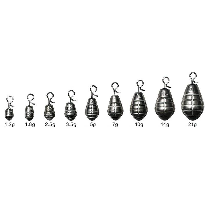 Estes pesos em forma de granada são muito práticos para chumbar rapidamente as tuas montagens e iscas duras, encaixando-os no ilhó ventral ou de cabeça. Sendo de tungsténio, os Grenade TG são menores e, portanto, mais discretos do que os equivalentes em chumbo.