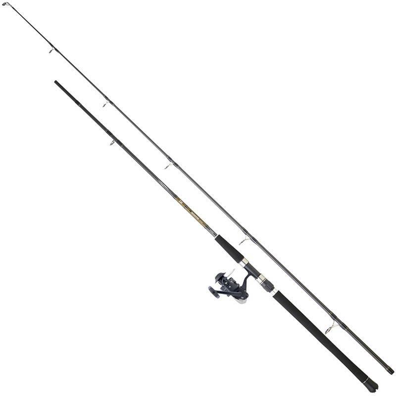 Um conjunto para a pesca do siluro com isco composto por uma cana Sweepfire em carbono (cabo integral em espuma EVA, anéis em óxido de alumínio e punho de cabo que permite o uso de um cinto de apoio) e por um carreto Daiwa Phantom 5000 (1 rolamento de esferas) com 8 kg de travão.