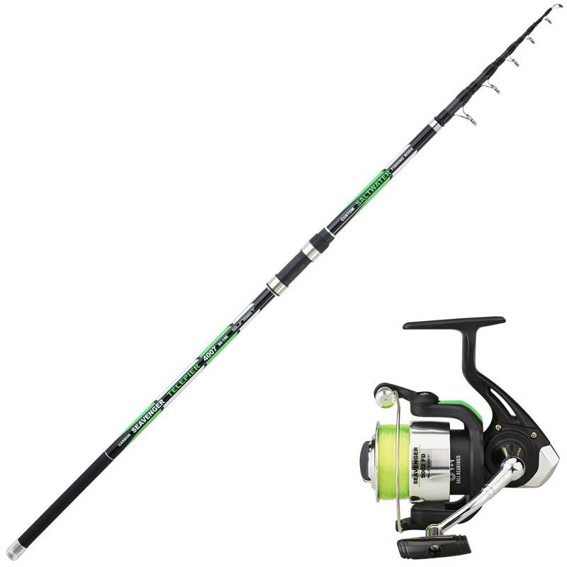 conceito original de vara em compósito e molinete com carretel em alumínio e manivela de combate em alumínio - entregue com um fio verde fluorescente que permite seguir facilmente a linha e ideal para pescas noturnas - especial para pesca da dourada em portos, desde os quebra-mares e os enrocamentos - ponta da vara em carbono para ainda mais detecção