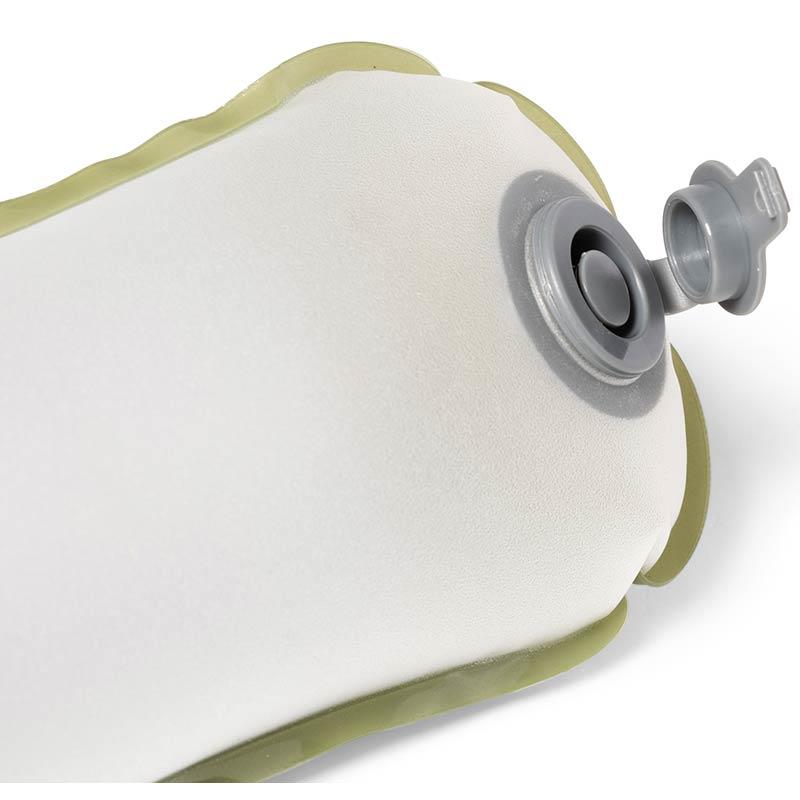 abra a tampa da válvula de ar, pressione o centro da válvula e mantenha-a pressionada para que o ar escape. o inflatable lite pode agora ser enrolado ou dobrado.
