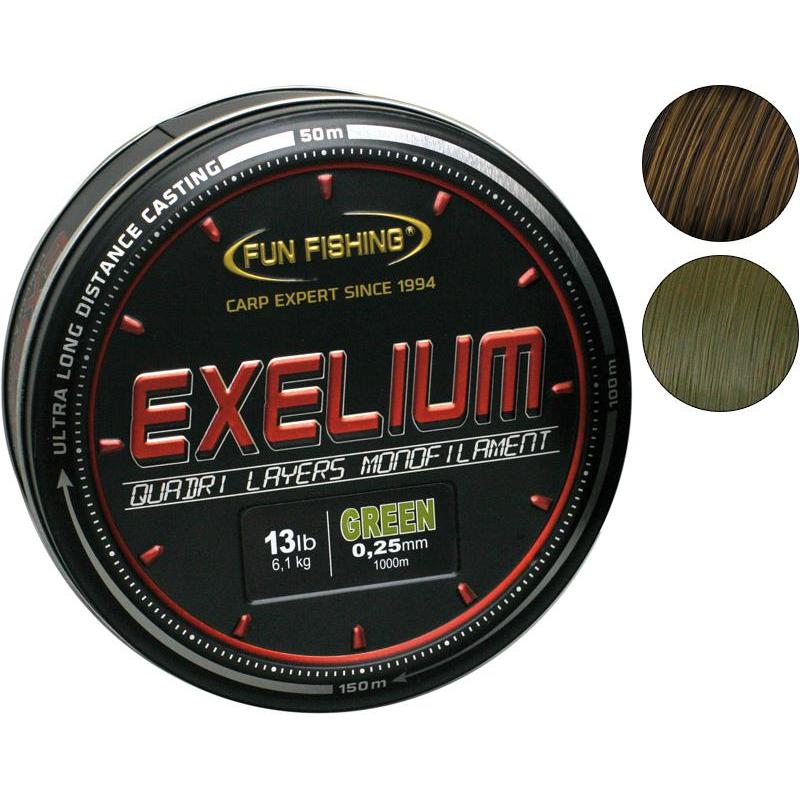 A nova formulação do EXELIUM é um concentrado de tecnologia e constitui um avanço importante em matéria de monofilamento High-Tech. Graças à sua estrutura composta por 4 camadas, cada uma com as suas características próprias (resistência aos nós, resistência à abrasão, excelente deslize, pouca memória), ele está entre os melhores monofilamentos europeus. O seu duplo tratamento de superfície, silicone & teflon, oferece um deslize excecional, o que permite lançar a grandes distâncias (enviámos um chumbo para além de 150m com 0.40mm !!!). Está disponível em verde e kamo. O Exelium é entregue numa caixa metálica que realça as suas características excecionais
