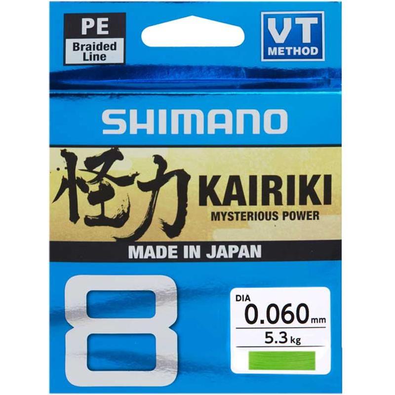 A nova Kairiki 8 Shimano é a versão atualizada da primeira Kairiki, ainda fabricada no Japão, mas com uma tecnologia de trançado adicional chamada «VT construction Method». Esta linha trançada PE é muito resistente e lisa, para maiores distâncias de arremesso. Está disponível do diâmetro 0,06mm a 0,42mm, com uma resistência máxima de 46,7kg para este último. É ideal para todas as pescas de arremesso, em água doce como em mar, pois é muito sensível, lisa e silenciosa. Além disso, para complementar as cores verde (Mantis Green) e cinza (Steel Grey), ela passa a estar disponível também em amarelo (muito visível) e em multicolor (para pescas em profundidade). A Kairiki 8 é finalmente uma excelente linha para Jigging, pois beneficia de uma baixa resistência à água e de uma elasticidade inferior a 3%.