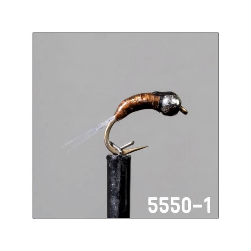 5550-1: Ninfa de base curvada pesada e classificada como ninfa imitativa. Montagem perdigone em corpo liso castanho com clipes que facilita a imersão completada por uma etiqueta preta que representa um saco alar e atenua o sinal da esfera. Esfera de prata para responder aos peixes curiosos e/ou reativos. Ninfa geral com um aspecto natural.