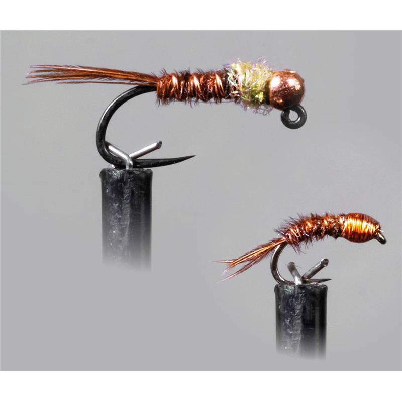 5554-1 : Ninfa reta leve e classificada como ninfa imitativa. Modelo inspirado na célebre « Pheasant Tail ». Montagem jig com corpo em faisão. Conta e cerclagem em cobre para manter um aspecto neutro. Adição de um tórax em fibras sintéticas cor oliva escura para assegurar ligeiros reflexos e evidenciar a imitação. Ninfa que oferece um aspecto natural.
