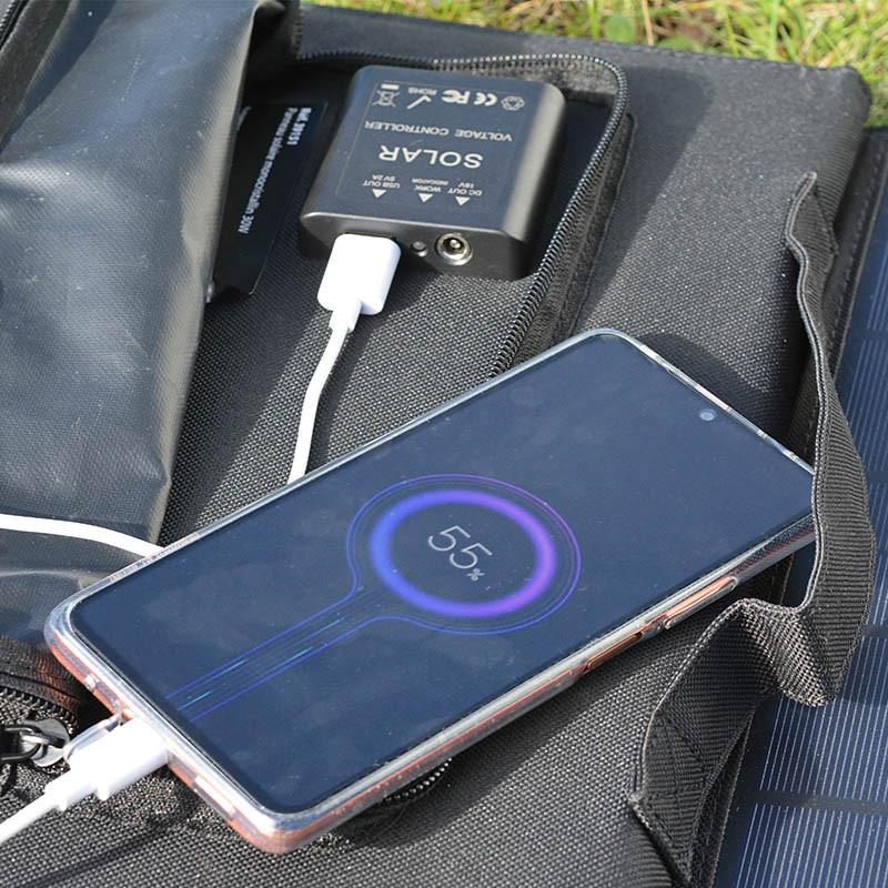 Fácil de usar, fácil de instalar no telhado de uma cabana de jardim, uma carrinha ou numa tenda. Possibilidade de carregar dispositivos móveis diretamente graças à sua porta USB