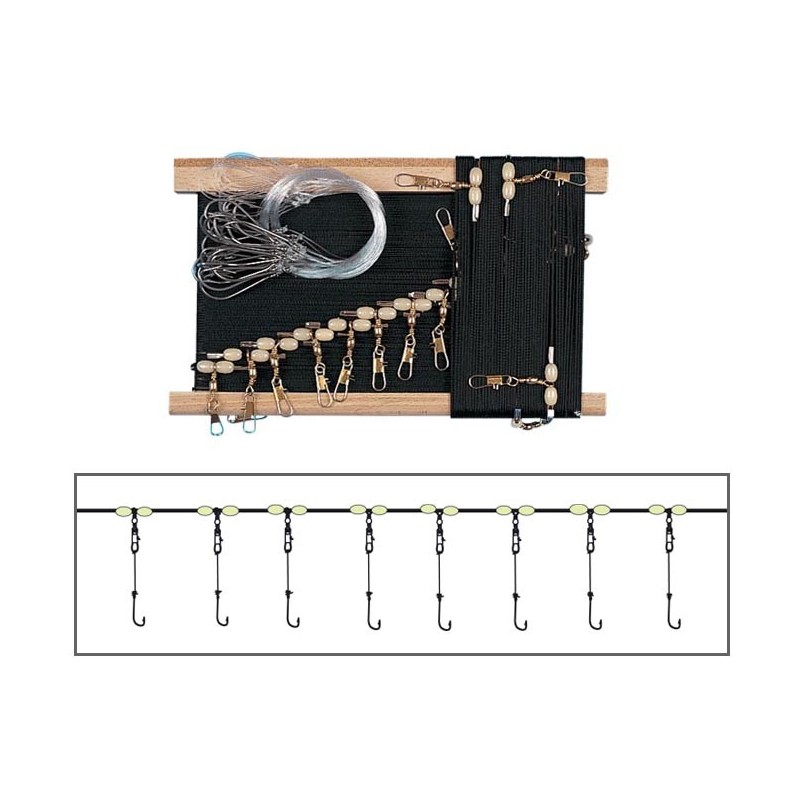 Todos os palangres FLASHMER têm 50m e cada anzol é montado sobre estralho com destorcedor com grampo para evitar torção.