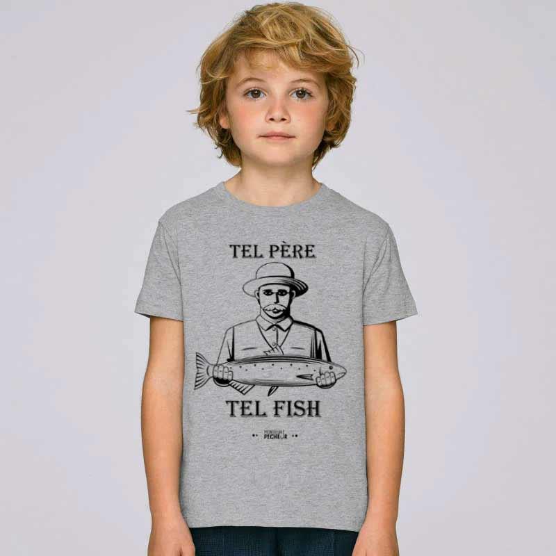 T-shirt infantil em algodão orgânico para um filho de pescador que assumirá o legado. A pesca é um passatempo que se partilha entre pai e filho, ou pai e filha. Uma grande ideia de presente para fazer feliz um rapaz que já tem a fibra da pesca.