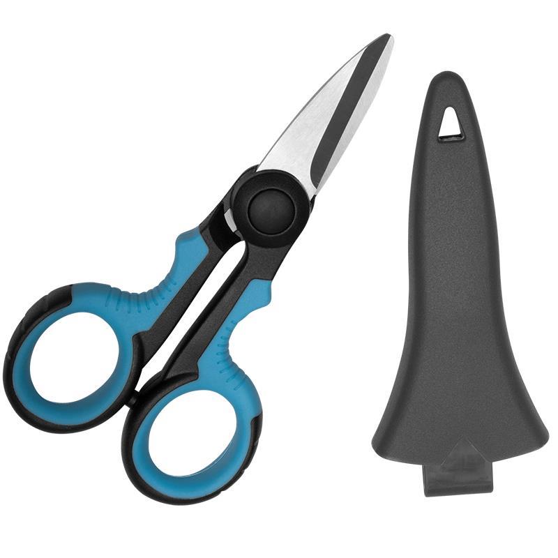 Tesoura micro serrilhada e afiada como uma navalha, com uma capa personalizada fácil de prender aos cintos, coletes e sacos de pesca.